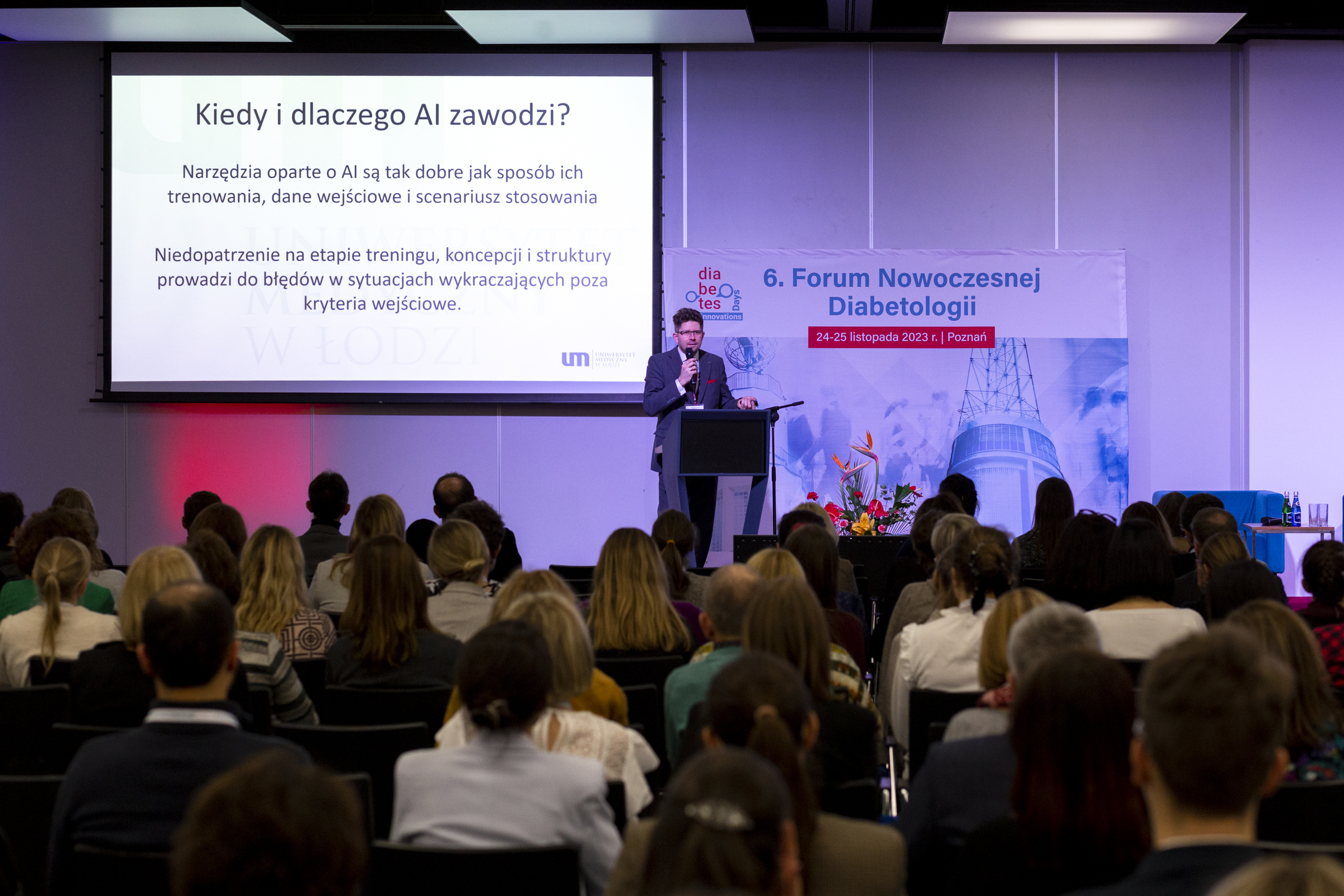 Prof. dr hab. Wojciech Fendler podczas swojego wystąpienia w wykładzie Inauguracyjnym „Jasne i ciemne strony sztucznej inteligencji w medycynie” przybliżył możliwości jakie daje AI, która przez rozbudowaną sieć neuronową potrafi szybciej i celniej niż lekarz diagnozować niektóre schorzenia, a nawet rozpoznawać potencjalne zagrożenie czy powikłania. Postęp technologiczny dotyczy również monitorowania i leczenia cukrzycy np. systemy ciągłego monitorowania glikemii, pompy insulinowe, czy możliwość wykorzystania AI w sztucznej trzustce, która uczyłaby się zmian zapotrzebowania na insulinę dla danego pacjenta. Dzięki ciągłemu trenowaniu sztuczna inteligencja potrafi uczyć się i coraz celniej działać. Jednak jak zaznaczył prof. Fendler, jest jeszcze dużo niewykorzystanych możliwości rozwoju AI w medycynie, ale także wiele zagrożeń. Jako ciemne strony sztucznej inteligencji wymienił: możliwość zastąpienie człowieka przez maszynę, niedoskonałości w przewidywaniu i rozpoznawaniu zagrożeń medycznych, skomplikowany proces wytrenowania AI do indywidulanych potrzeb każdego pacjenta, czy zbyt małą liczbę parametrów medycznych, które pozwalają celniej diagnozować. Z kolei z zagrożeń bezpośrednich dla pacjentów wskazał na przykład różne możliwości interpretacji odpowiedzi wygenerowanych chociażby przez ChatGPT.