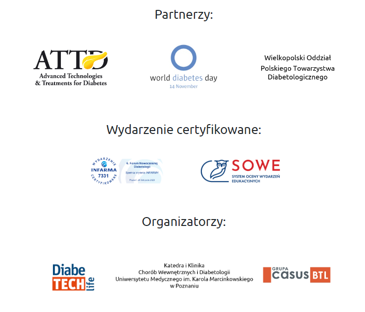 Organizatorami 6. Forum Nowoczesnej Diabetologii byli: Katedra i Klinika Chorób Wewnętrznych i Diabetologii Uniwersytetu Medycznego im. Karola Marcinkowskiego w Poznaniu, Grupa casusBTL oraz DiabeTECH.life przy partnerstwie Advanced Technologies & Treatments for Diabetes (ATTD), Word Diabetes Day oraz Wielkopolskiego Oddziału Polskiego Towarzystwa Diabetologicznego.